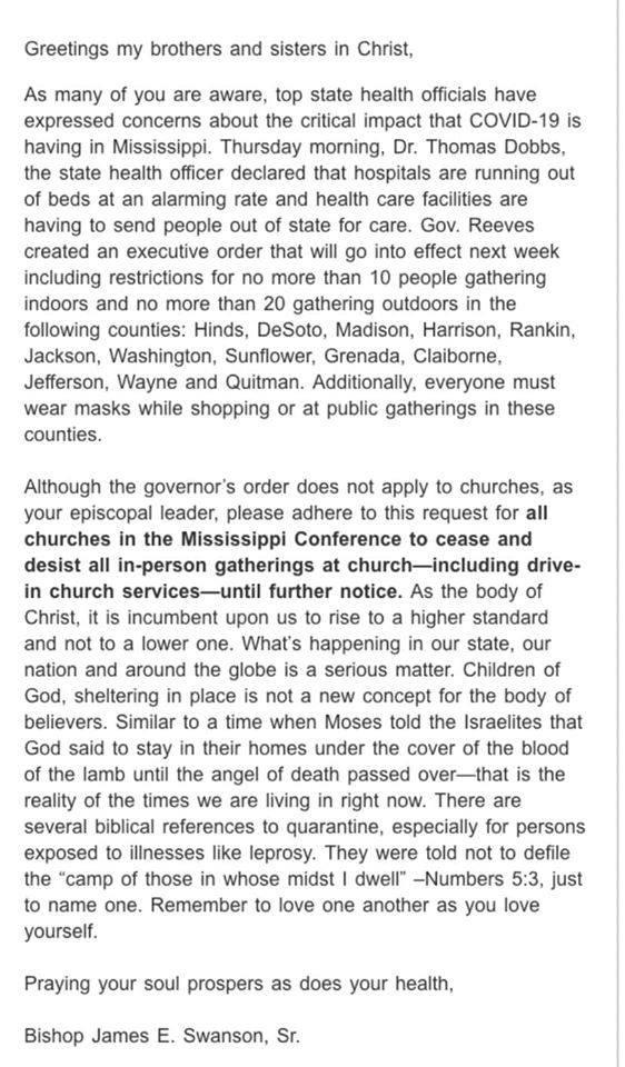 Attention sisters and brothers of Crossroads UMC and Refuge UMC. We have seen a considerable increase of COVID19 cases in the state of MS and your safety is of utmost importance to me as your appointed pastor. I have received word from Bishop James Swanson and received confirmation from District Superintendent Larry Hilliard that we are advised by the Bishop to not have in-person gatherings or drive-in services at this time. Please share this communication, stay safe, and continue to connect and fellowship with us online through our streaming Sunday services, our Wednesday online Ephesians Study, and other small group Zoom meetings. Thank you for your understanding and please stay safe.